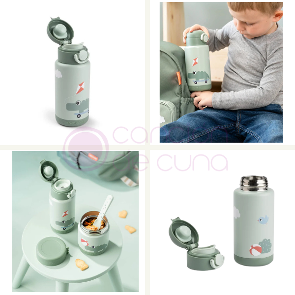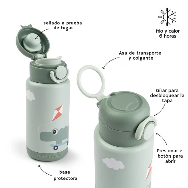 Botella Térmica Done By Deer de 340 ml con botón fácil, cierre hermético y diseño divertido. Mantiene las bebidas 6 horas. Perfecta para peques autónomos.