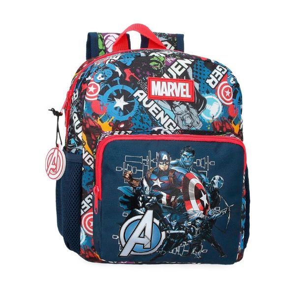 Mochila Preescolar Legendary-Avengers con bolsillos laterales, compartimento interior y sistema adaptable a carro. Perfecta para el cole, salidas o excursiones.