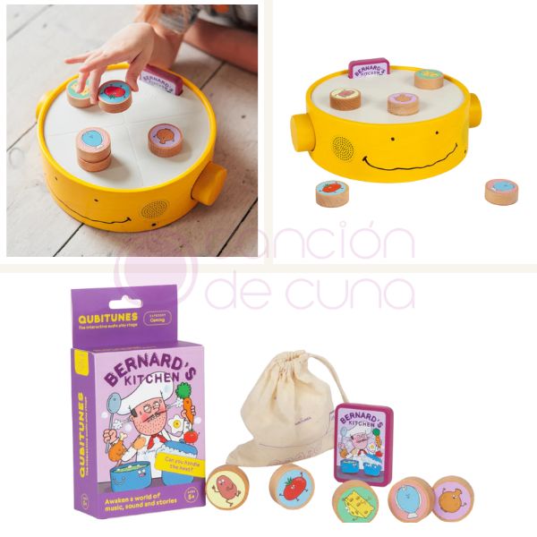 Qubitunes Bernard’s Kitchen es un juego interactivo de madera que convierte la cocina en una aventura sonora llena de creatividad. Diseñado para funcionar como expansión del sistema Qubitunes, ofrece una experiencia sensorial donde los peques colocan bloques físicos («qubits») en la base interactiva para activar sonidos, efectos de cocina y pequeñas secuencias temáticas.