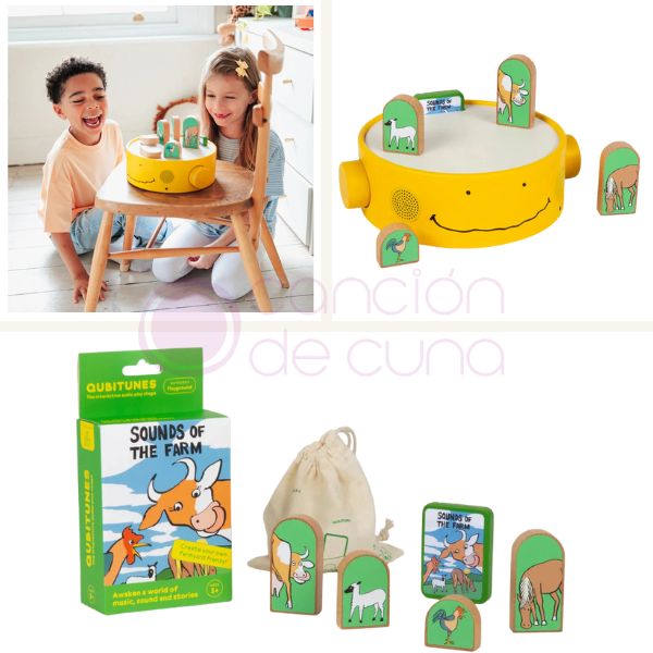 Qubitunes Sonidos de la Granja es un juego interactivo que convierte la granja en una experiencia sonora divertida para los peques. Funciona como expansión del sistema Qubitunes: al colocar bloques de madera («qubits») sobre la base interactiva, se activan sonidos de animales y efectos rurales como mugidos, cacareos, balidos o ruidos del campo.